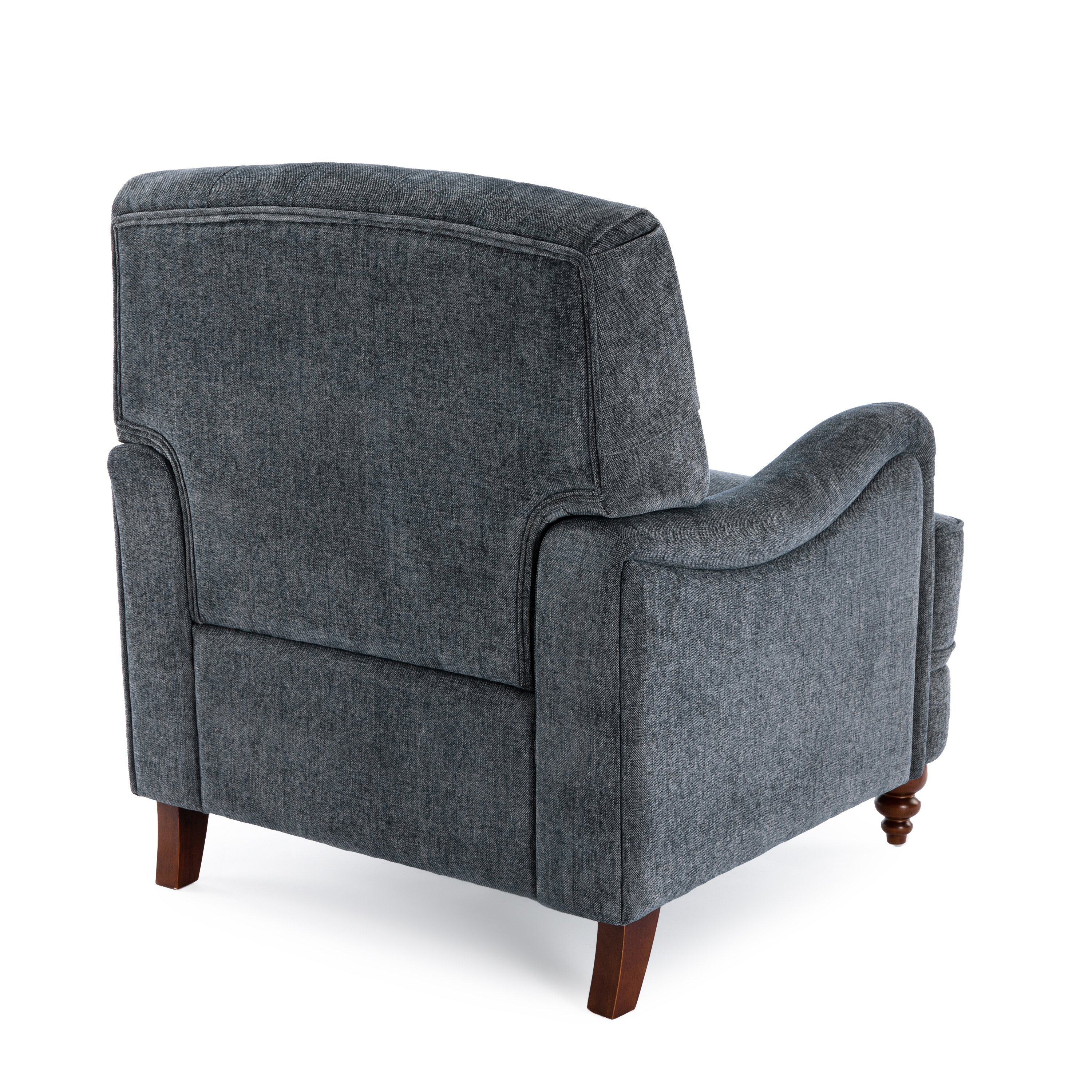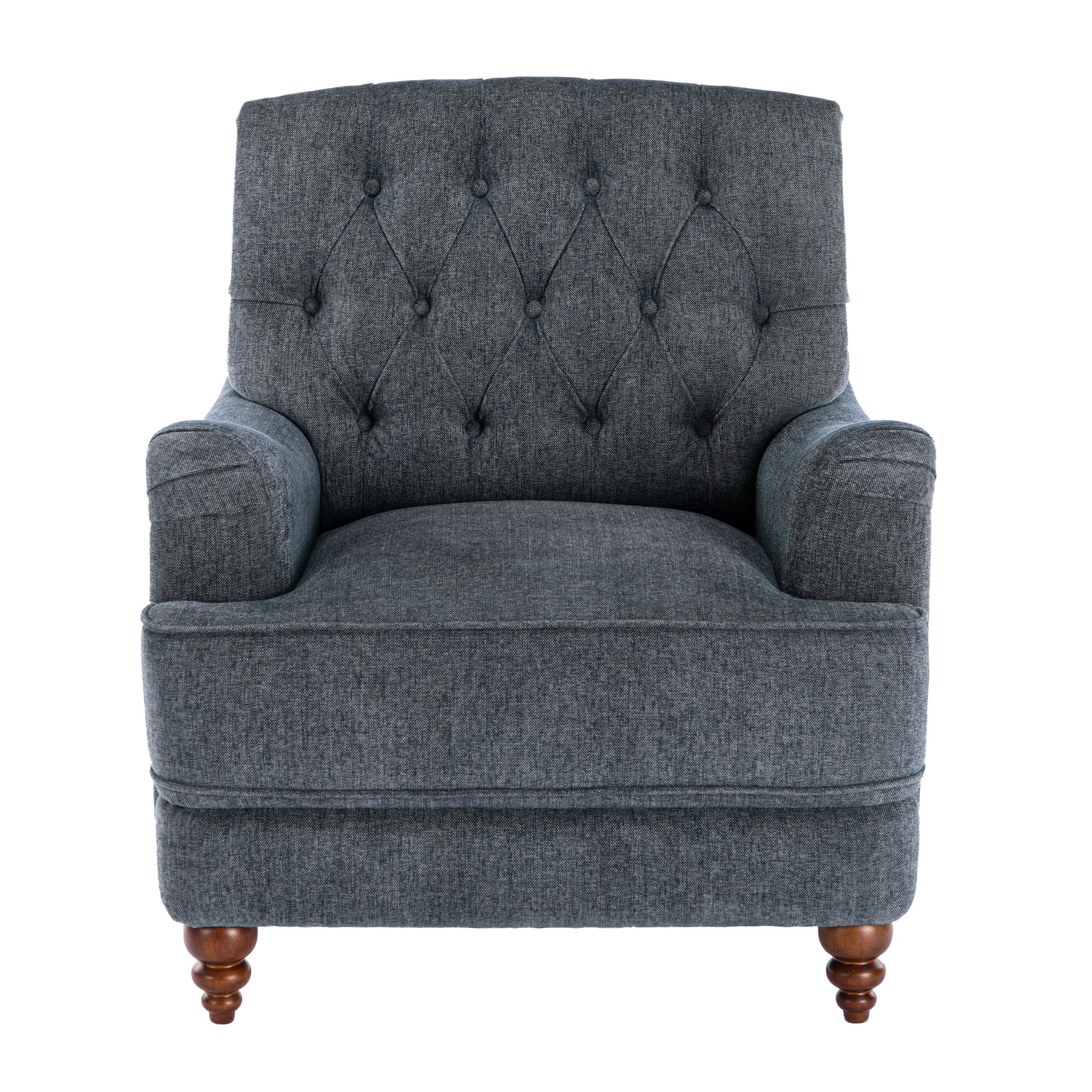 The Butner tufted back arm chair welcomes you home with classic styling and well appointed details. The tailored English Roll arms offer a graceful shape while the overstuffed seat and tufted back allow you to nestle into comfort. Solid wood turned front legs are finished in a deep walnut stain adding to this chairs timeless appeal. Just right to complete a seating area or for use in the living room, office, or bedroom. Available in your choice of Sea Oat, Oatmeal or Navy. Your purchase includes one arm chair.