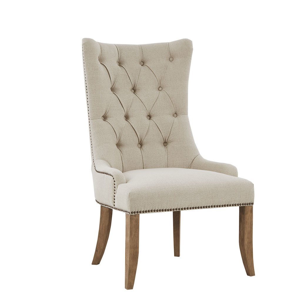 Add a stunning farmhouse update to your home decor Madison Park Lucas accent chair. This accent chair features a high, button-tufted back and antique bronze nailhead details that creates an elegant look. The natural fabric upholstery is complemented by the wheat finish on the solid wood legs to complete the farmhouse aesthetic. With its charm and sophistication, this accent chair elevates the style of your home decor.