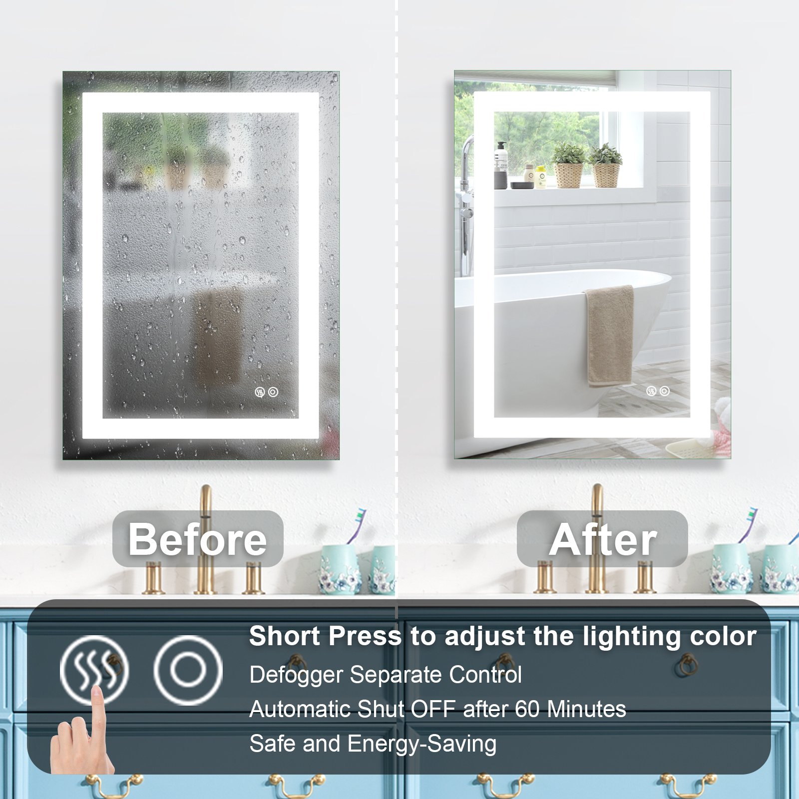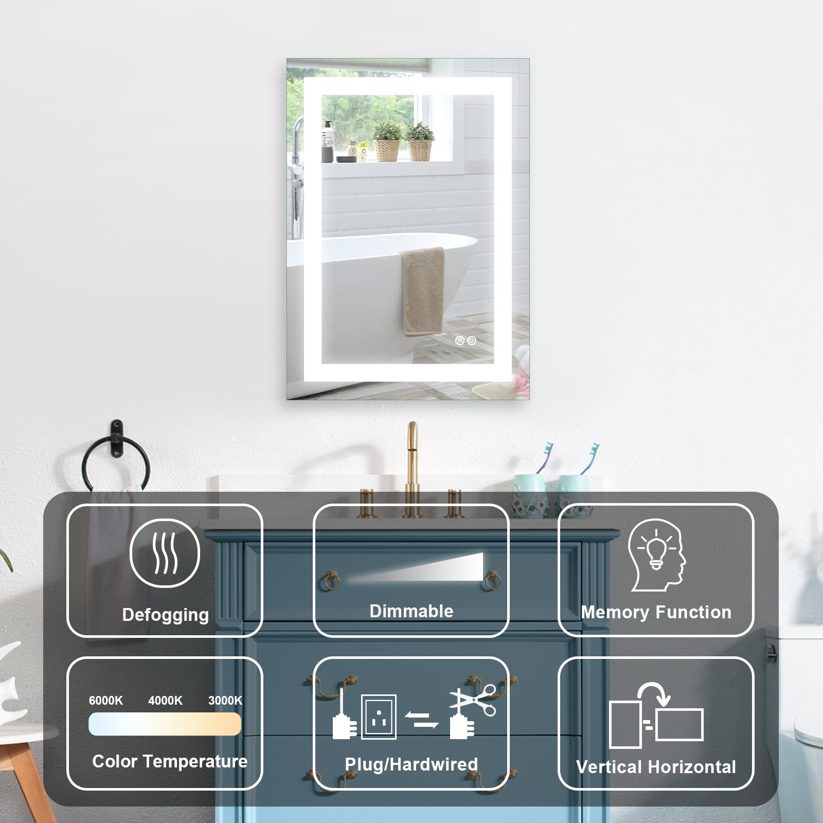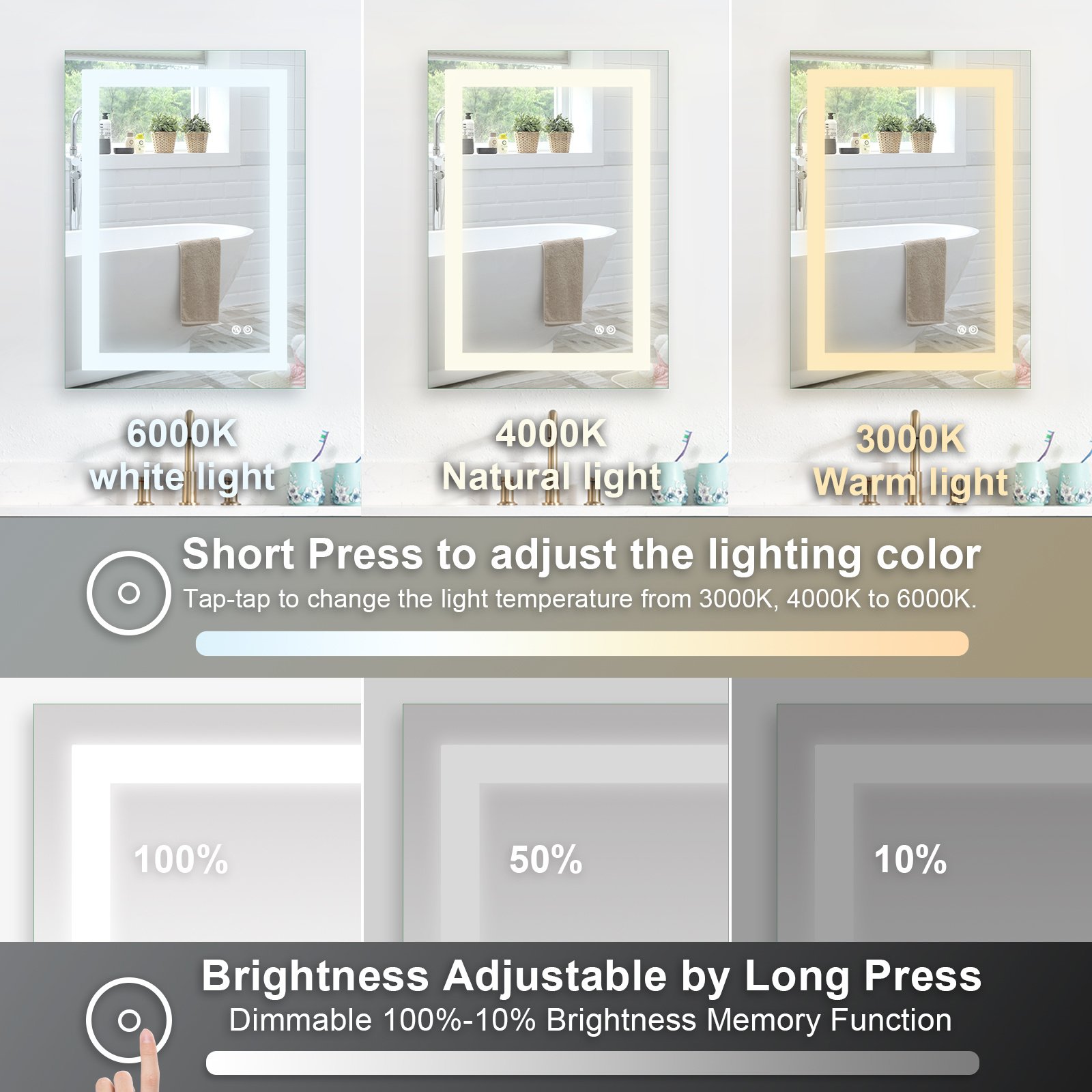 The bathroom mirror with LED light; Made of high qualit Anodized aluminum can be used for long time. High tech Intelligent bathroom vanity makeup mirror with defogging function. Touch sensor button can adjustable mirror color brightness from 2700K-6300K to meet the needs of different light. Brightness can be adjusted freely from 10 % to 100%. Large size bathroom mirrors wall mounted design; it is space-saving. Bright mirror can make your bathroom or living room can be more spacious; Better mood. Perfect for bathroom; bedroom; dressroom; powder room and more.