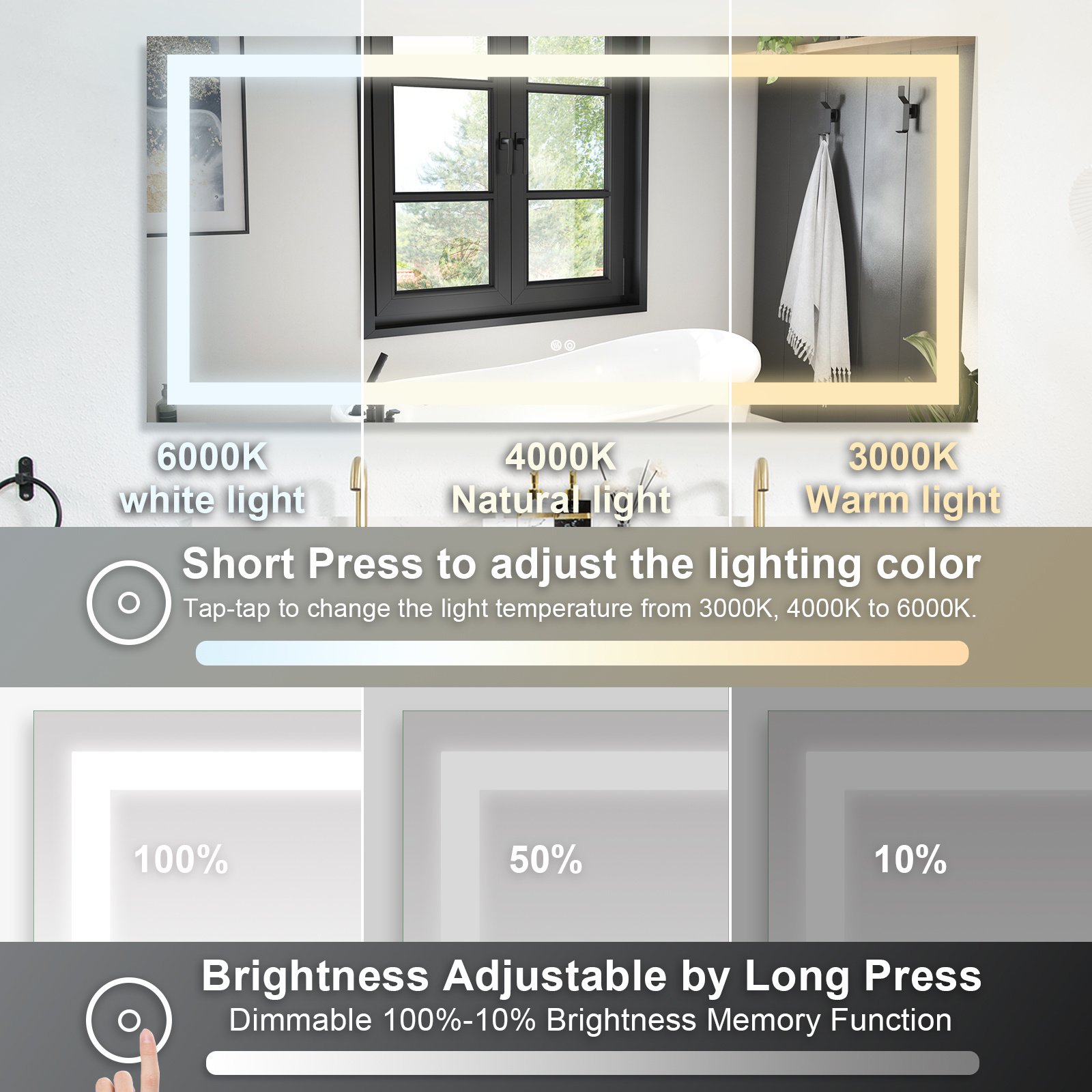The bathroom mirror with LED light; Made of high qualit Anodized aluminum can be used for long time. High tech Intelligent bathroom vanity makeup mirror with defogging function. Touch sensor button can adjustable mirror color brightness from 2700K-6300K to meet the needs of different light. Brightness can be adjusted freely from 10 % to 100%. Large size bathroom mirrors wall mounted design; it is space-saving. Bright mirror can make your bathroom or living room can be more spacious; Better mood. Perfect for bathroom; bedroom; dressroom; powder room and more.