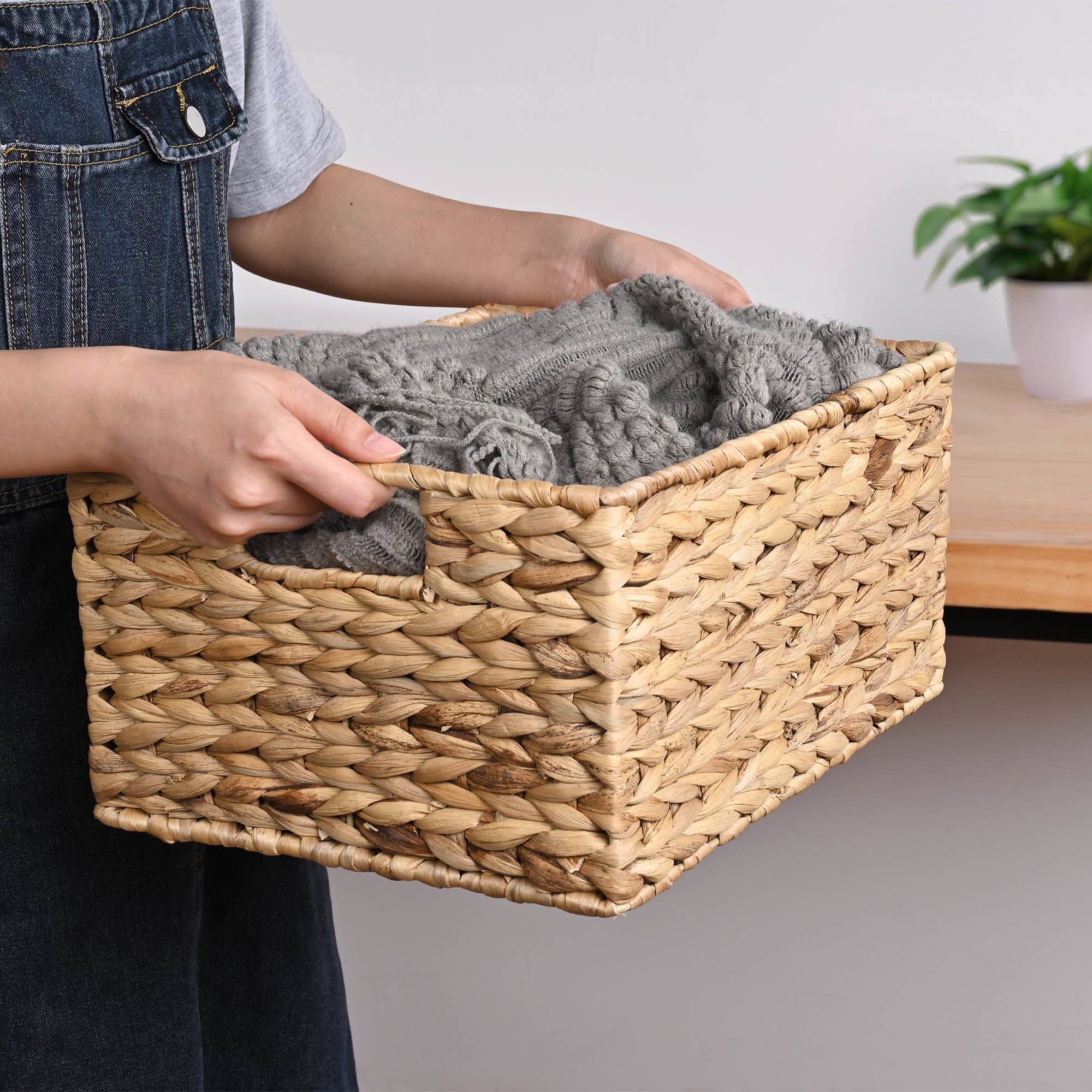 - Farmhouse Style Wicker Baskets - Aquaterior Handwoven Basket Set includes 3 different sized rectangular wicker baskets; handwoven from water hyacinth in light brown hue; featuring intricate weave pattern & natural finish to present a raw; organic feel to your living space; perfectly blending into any rustic-themed bathroom