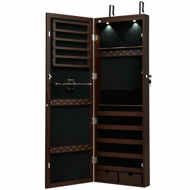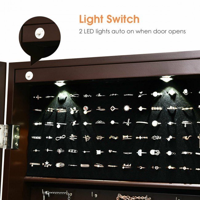 Wall/door mounting design saves much floor spaceKey lockable door keeps jewelries in privacy and safetyGets your jewelry in well organized and prevents from getting tangledGlass full-length mirror provide you with clear head-to-toe view2 romantic LED lights (battery not included) add a warm atmosphere to your roomSuperior MDF construction ensures stability and durability and easy cleanStylish white finish adds a sense of elegance and is easy to cleanOxidation resisting velvet liner prevents your jewelries from scratchesAdjustable hanging hook in 3 heights allows you to customize the installation heightConsist of 50 ring slots; 1 scarf rod; 5 shelves; 2 drawers; necklace hooks and earring hooksSimple but exquisite appearance that goes well with any decor