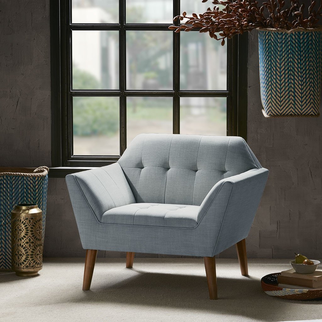 Accent your living area with the mid-century allure of INK+IVY's Newport Lounge Chair. The tight back and seat offers extra plush comfortable seating and features a clean tailored look accented with button tufting details. Textured upholstery and a pecan finish on the tapered wood legs gives this lounge chair a warm contrast and alluring appeal. With its beautiful design and small silhouette, this mid-century lounge chair is sure to make a statement in your living room. Leg assembly is required.