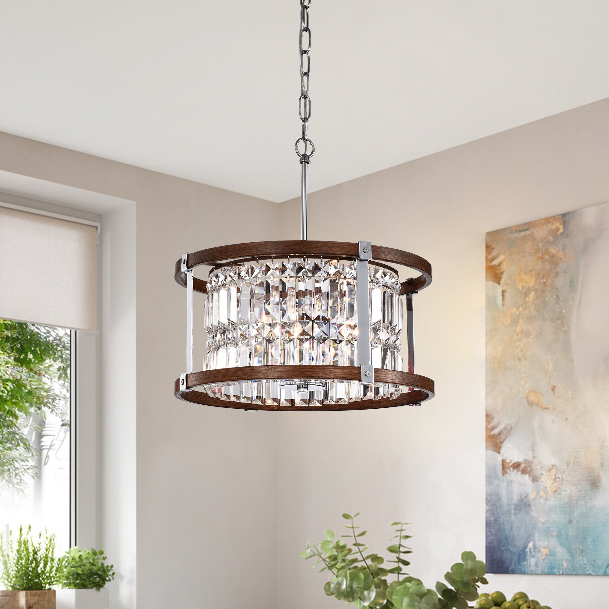Brighten up the space over your dining table with this Azari chandelier. The drum-shaped frame pairs a woodgrain finish with royal-cut crystals to transform the look of your space with chic lighting.