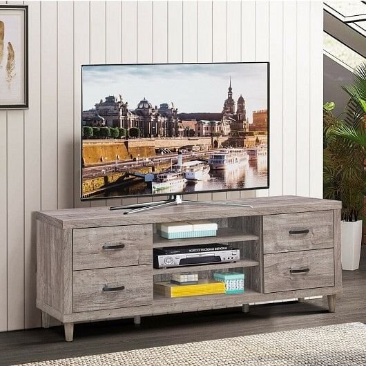 Retro Wooden TV Stand with 3 Open Shelves and 4 Drawers Retro Wooden TV Stand with 3 Open Shelves and 4 Drawers Retro Wooden TV Stand with 3 Open Shelves and 4 Drawers