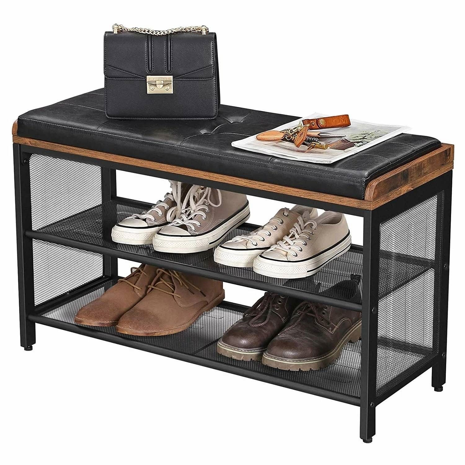 This Black Metal Entryway Shoe Rack Storage Bench with Padded Seat Cushion has a glossy imitation leather and 2 dense mesh steel grid shelves for shoes topped off by a rustic brown surface-there is really a lot to discover on this shoe bench. Take a seat on the comfortable, removable seat cushion and put on your shoes without hurrying. Equipped with adjustable feet, this shoe rack can withstand a spirit level test even on uneven floors; also your tiles, linoleum, and wood floors are protected from scratches. In this case, please contact our friendly customer service and treat your hallway, living room, or bedroom with this product. Thanks to the manageable number of individual parts and the easy to understand instructions, this shoe bench is easy to assemble. In just a few steps you have a stable metal, wood, and artificial leather mix to fall in love with.