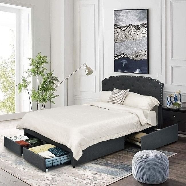 This Full Size Grey Linen Adjustable Headboard 4 Drawer Storage Platform Bed comes with a steel frame and 2 kinds of foot pads (anti-slip and adjustable) and hold up to 660 lbs. The whole bed frame is covered with breathable linen fabric, offering a soft touch and feel. The high headboard is adjustable from 41" or 44"depending on the mattress thickness you choose. At the bottom, 4 deep drawers fitted with casters offer roomy storage space for seasonal clothes, pillows, bed sheets and more. Thanks to a platform design, a mattress will be directly supported without a box spring.