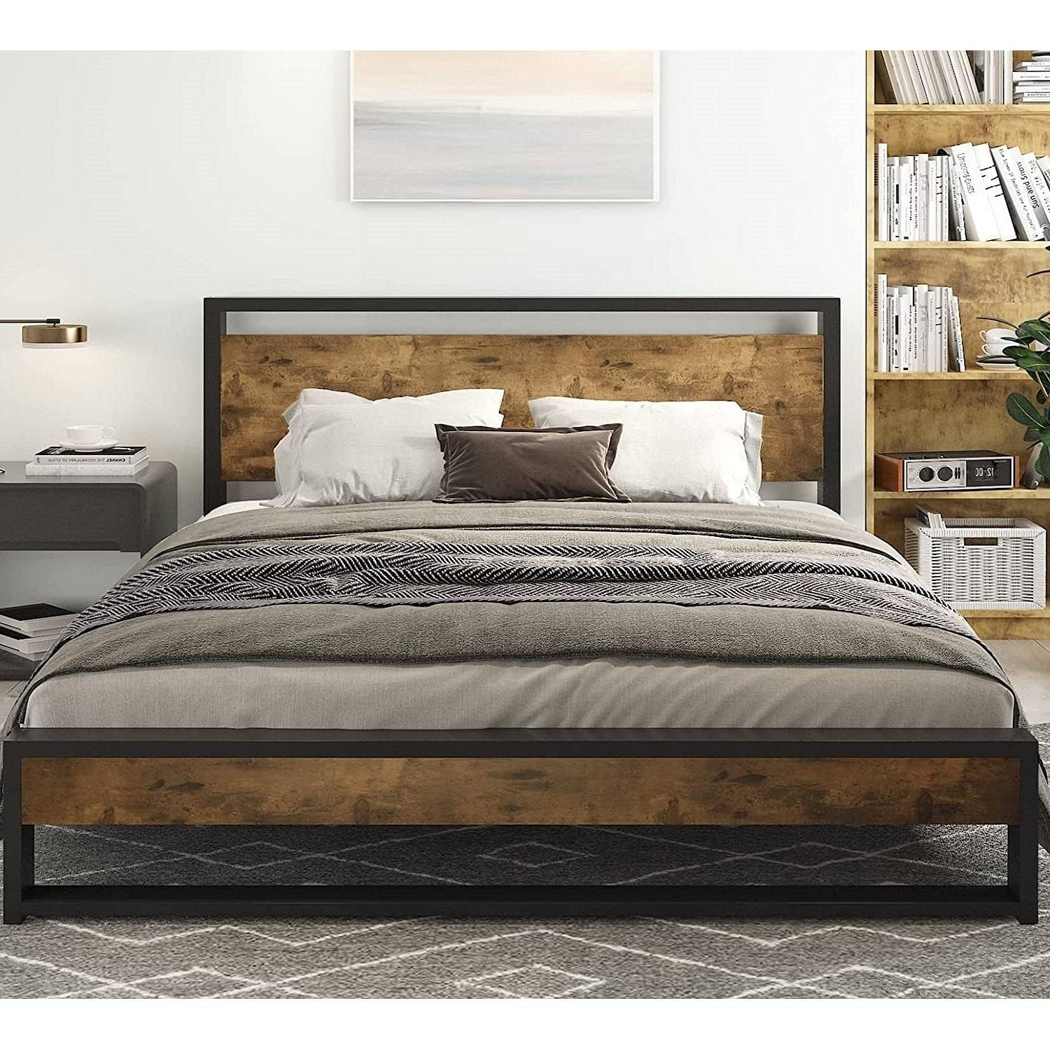 This Queen Modern Farmhouse Platform Bed Frame with Wood Panel Headboard Footboard would be a great addition to your home. Black metal frame is with beautifully accented wood and is noise-free.