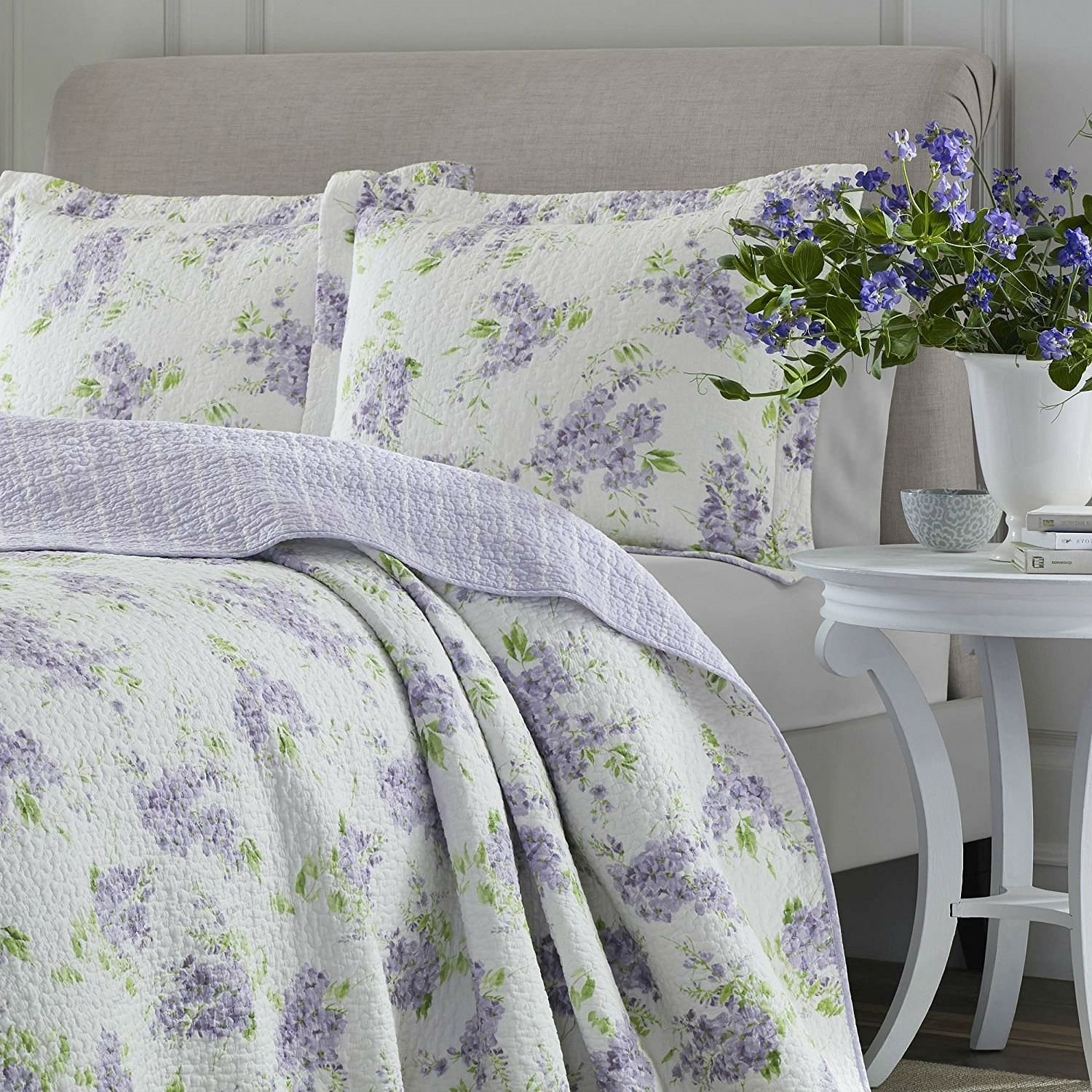 Wisteria blossoms cascade across a pristine white background in this Full / Queen size 3-Piece Cotton Quilt Set with White Purple Floral Pattern that will bring a touch of springtime to your bedroom. Pale Lilac tones mix with grass green for a fresh, clean color palette, accented by the white vine stripe print on an Amethyst ground for the quilt reverse. The all cotton quilt is pre-washed for extra softness and the allover vermicelli quilt stitching adds dimension and extra comfort.