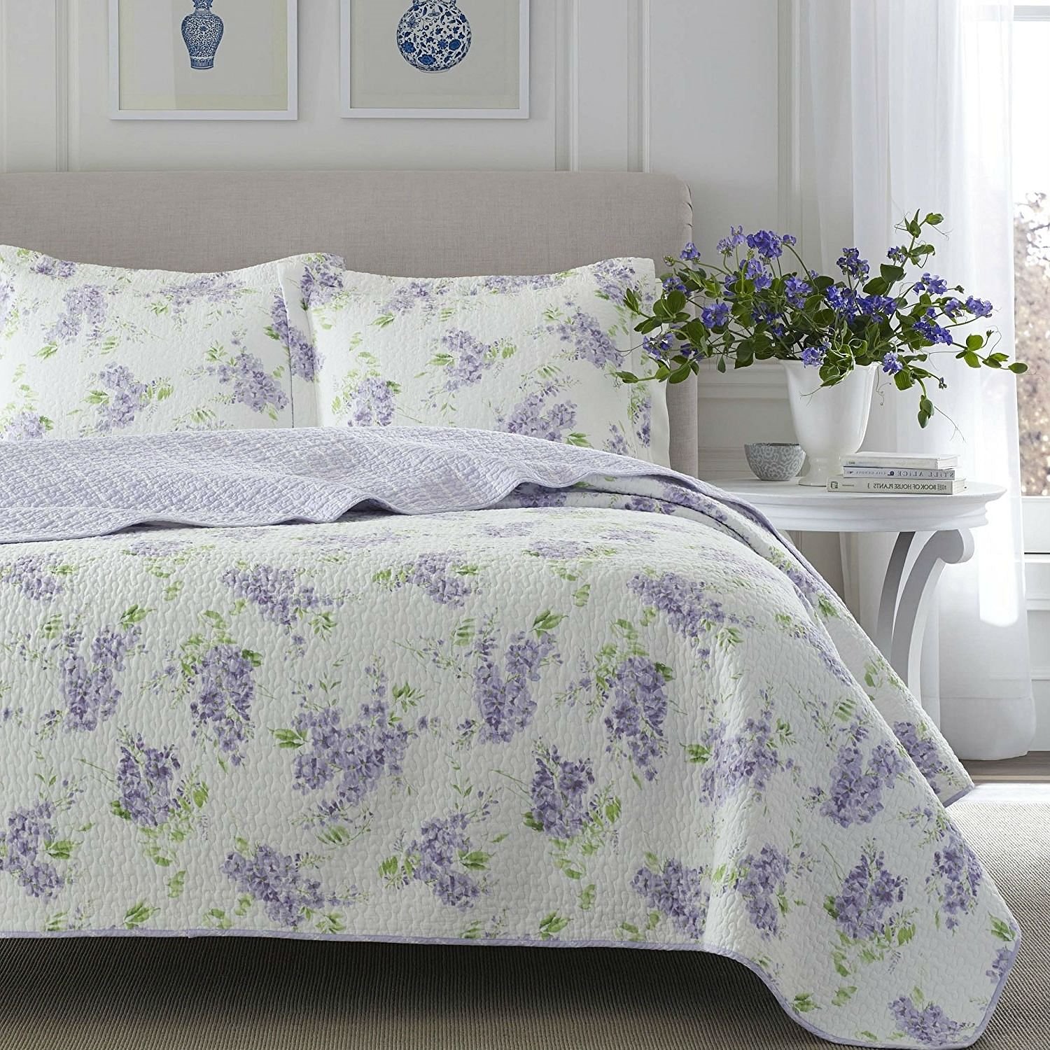 • Full / Queen size 3-Piece Cotton Quilt Set with White Purple Floral Pattern