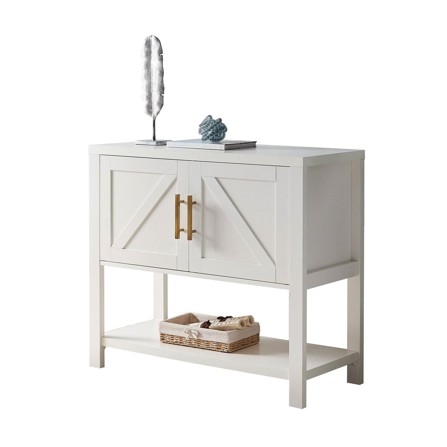The Modern 2 Drawer Wooden Storage Console Table White brings classic style to your humble abode with a clean lined silhouette and open design lower shelf. This sturdy console is crafted from manufactured wood. It sports 2 cross panel fronted doors revealing 2 spacious interior cabinets ideal for stowing away larger necessities and keeping them out of sight while the accented metal door handles add a high-end and modern appeal.
