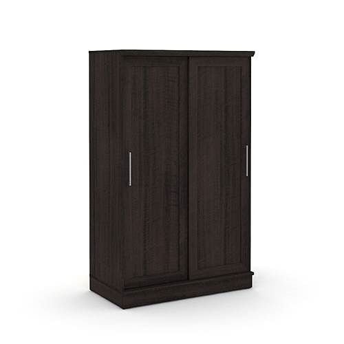 Hideaway storage options never looked so sleek with this FarmHouse Espresso Oak Sliding Doors Garment Rod Wardrobe Armoire. This wardrobe with sliding doors features 2 garment rods behind a set of sliding doors that offer hidden hanging storage. This storage cabinet with sliding doors can be customized to your liking as the garment rod behind the left door can be placed in 2 positions to accommodate longer or shorter items. This 2-door armoire cabinet features 3 adjustable shelves for customization and to accommodate items of various sizes, as well as 1 fixed shelf. Use these shelves for stacks of sweatshirts, shoes, or seasonal dcor.