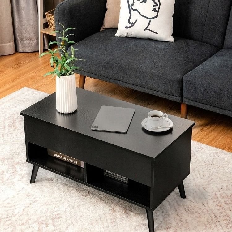 This sturdy multi purpose Mid-Century Lift-Top Coffee Table Sofa Laptop Desk in Black Wood Finish is equipped with a built-in metal lifting mechanism. If you raised the top, it would raise up automatically to save your energy. The whole lifting process of the desktop is smooth and silent without wobbling and there are several crash pads on table frame to avoid damage. This coffee table comes with 3 large storage sections, offering enough storage space. 2 storage shelves in the bottom of the coffee table allow you to put items on it for convenient access.