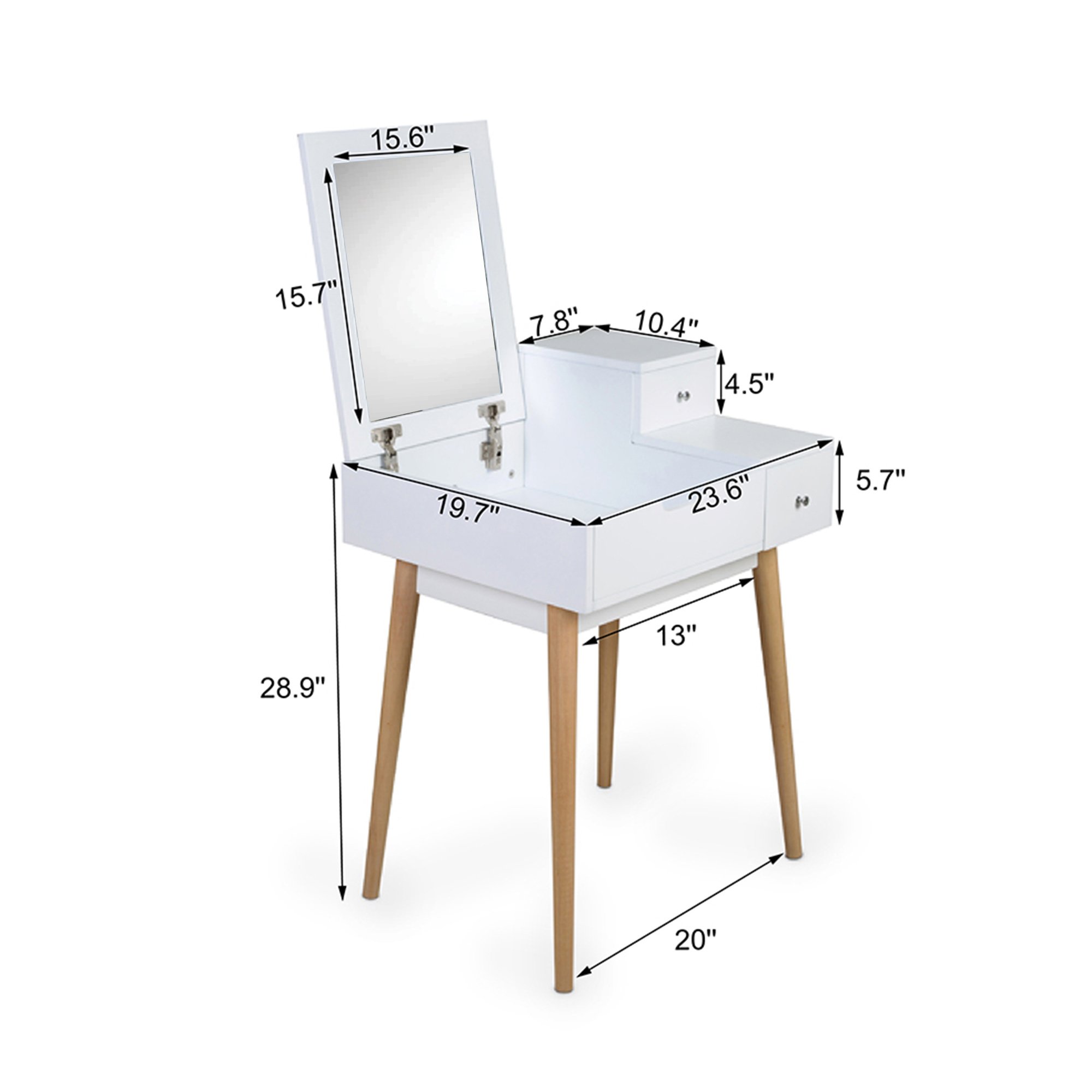 High Quality Material:Made of high quality of MDF wood and solid wood; which make the table surface beautiful and smooth. Flip Top Mirror:which make it convenient to makeup while saving space for essential storage Big Storage Space:There is a big storage space and two more drawers which can storage more makeup cosmetics. Elegant and Stylish Design:White table body with solid wood simple legs; which is simple and generous; stable and durable.